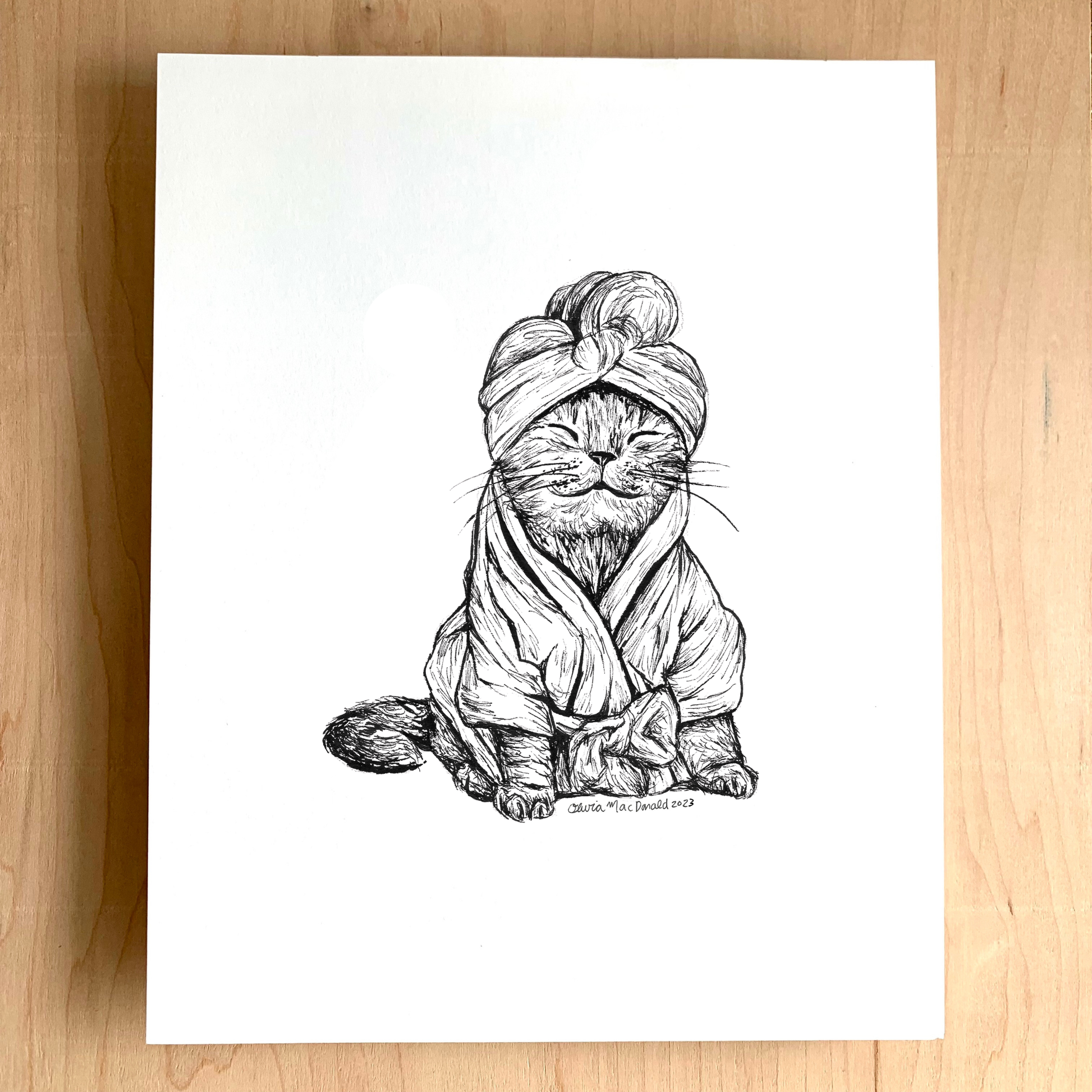 This 8"x10" black-and-white illustration features a smiling cat wrapped in a tiny bathrobe and hair towel, radiating calm, comfort, and a touch of humor. The detailed linework is created in my signature pen and ink style, bringing personality and charm to every stroke.